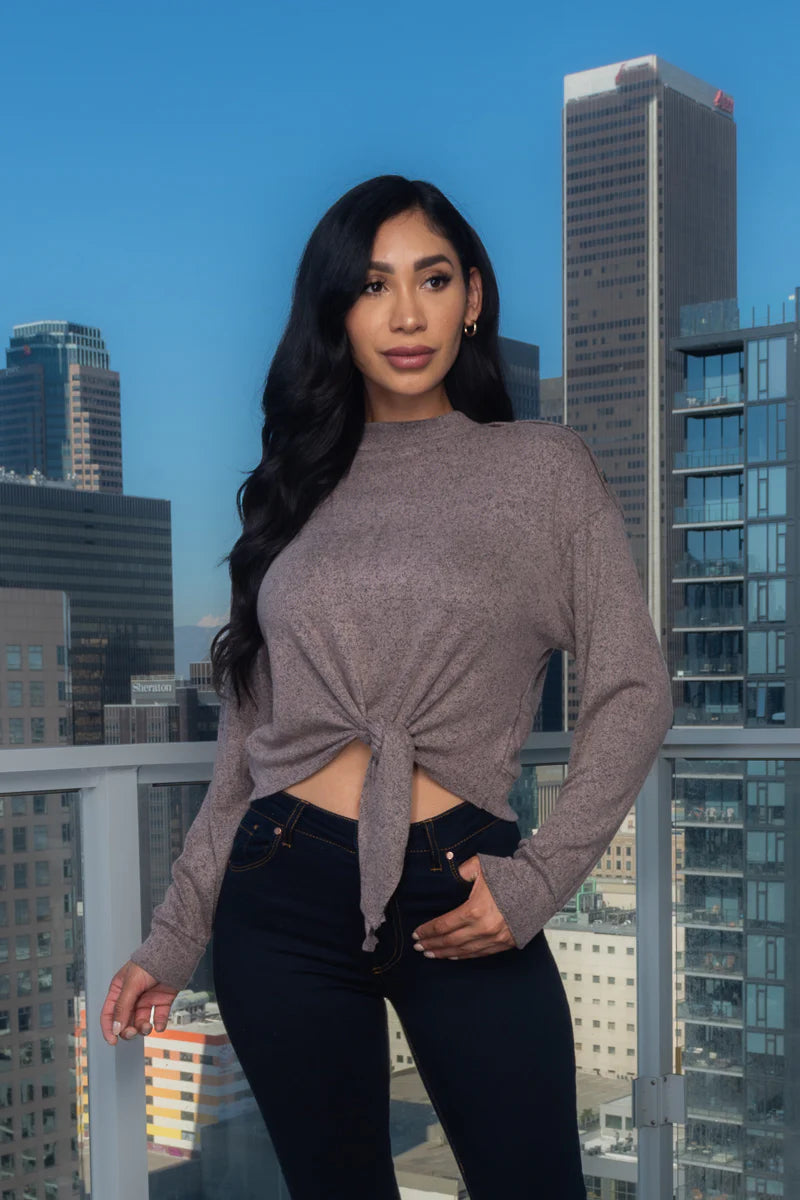 Soft Long Sleeve Round Neck Top W/ Fake Buttons on Shoulders & Front Bow Tie